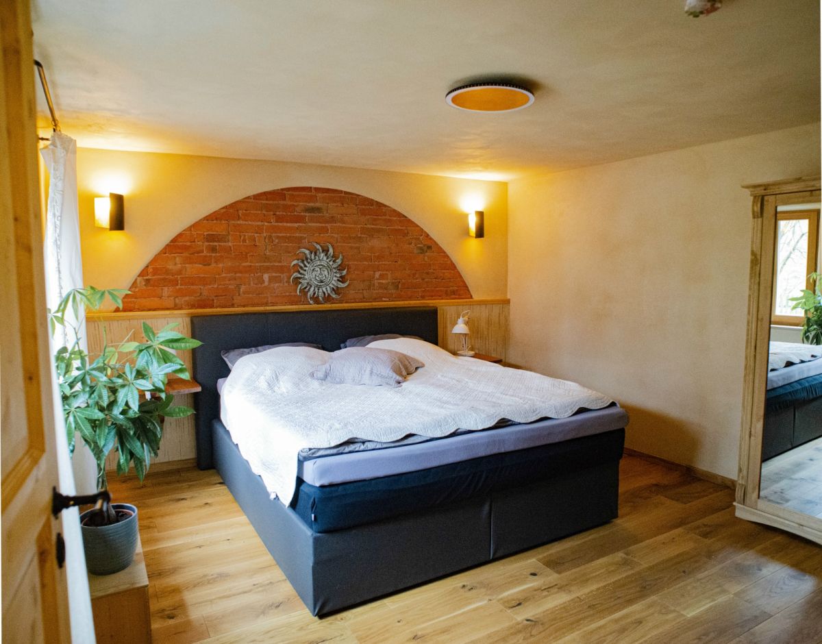 Die Ferienwohnung VanDaLucia gilt als Praxis-Beispiel einer komplett ökologisch sanierten, stilvollen Wohnung. Sie hat 90 qm Wohnfläche, einen eigenen Eingang und eine schöne, große Terrasse. Die Lehmwände und Fußboden-/bzw. Wandheizung schaffen ein gesundes Wohnklima zum Aufatmen. Die Sanierung und Einrichtung wurde mit viel Liebe zum Detail gemacht.